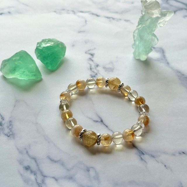 シトリンのブレスレットです。 構成は シトリン 8mm 12珠 スモーキークォーツ 8mm 8珠 ルチルクォーツ 10mm 2珠 ロンデル 3mm 4個 この天然石にヒーリングエネルギーを封入してお届けします。 シトリンの効果は… * 金運・財運の向上 * メンタルヘルス・自己肯定感の向上 * 人間関係の円滑化 * 仕事・勉強の効率アップ * 恋愛運を高める 石言葉は「勇気」「決断力」「成功」 …と言われています。 これらの石の持つ力をより向上させるために、同様の意味を持つ複数のエネルギーを封入。 5つのヒーリングエネルギーと5つのシンボルを使っています。 シトリンの他、スモーキークォーツ・ルチルクォーツ用のエネルギーも入っています。 【注意事項】 医療行為ではございません。 また、ヒーリングによる効果効能を保証するものではございません。 【サイズ】 内径 約17cm サイズ変更ご希望の場合は予めお問い合わせ下さい。 ご購入後のサイズ変更は承ることができません。 サイズ変更に伴い、デザインが大幅に変わる場合がございます。 1cm以上のサイズアップ、またサイズ変更において石の変更が伴う場合に追加料金をいただくこともございますので、ご了承下さい。 SOLDOUTの場合、次のお仕入れができるかは未定ですので、出会ったタイミングでお迎え下さい。 * * * * * 画像はできる限り現物に近づけて撮影しておりますが、光の加減、またお使いのPCモニターや端末の画面設定によって色味が違って見えることがございます。 イメージと異なるなどの理由での返品返金対応は致しかねます。 当店は「エネルギーを封入した雑貨品屋さん」です。 使用している天然石については、パーツ屋さんや天然石ショップなどで購入したものを使用しており、グレードや真贋についてはわかりかねます。 「エネルギーを封入した雑貨品」としてお考え下さい。 商品の性格上、一度人の手に渡ったものをお戻しさせていただくことは固くお断りいたします。 十分にご検討いただき、ご納得の上でご注文くださいますようお願いいたします。 * * * * *