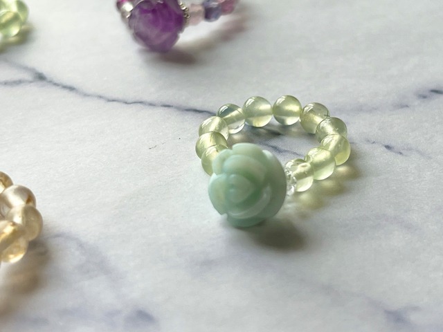 アマゾナイトの薔薇と翡翠のリングです。 構成は アマゾナイトの薔薇型 10mm 1珠 翡翠 4mm 12珠 クォーツロンデル 2個 この天然石にヒーリングエネルギーを封入してお届けします。 アマゾナイトの効果は… * 精神を安定させ、不安や恐怖を取り除く * 悩みを解消し、決断を促す * ストレスを解消し、イライラやマイナスの感情を浄化する * 自立心を育み、コミュニケーション能力を高める * 包容力を高める * エネルギーの活性化を促す * 精神と肉体のバランスを整える * 困っている時に助けとなってくれる人を引き寄せる * 魂の導き役として進むべき道を示す 石言葉は、「希望の石」「聖なる愛情」 …と言われています。 これらの石の持つ力をより向上させるために、同様の意味を持つ複数のエネルギーを封入。 3つのヒーリングエネルギーと4つのシンボルを使っています。 アマゾナイトの他、翡翠用のエネルギーも入っています。 【注意事項】 医療行為ではございません。 また、ヒーリングによる効果効能を保証するものではございません。 【サイズ】 8号(ゴムを使っていますので伸縮します) サイズ変更ご希望の場合は予めお問い合わせ下さい。 ご購入後のサイズ変更は承ることができません。 サイズ変更に伴い、デザインが大幅に変わる場合がございます。 5mm以上のサイズアップ、またサイズ変更において石の変更が伴う場合に追加料金をいただくこともございますので、ご了承下さい。 SOLDOUTの場合、次のお仕入れができるかは未定ですので、出会ったタイミングでお迎え下さい。 * * * * * 画像はできる限り現物に近づけて撮影しておりますが、光の加減、またお使いのPCモニターや端末の画面設定によって色味が違って見えることがございます。 イメージと異なるなどの理由での返品返金対応は致しかねます。 当店は「エネルギーを封入した雑貨品屋さん」です。 使用している天然石については、パーツ屋さんや天然石ショップなどで購入したものを使用しており、グレードや真贋についてはわかりかねます。 「エネルギーを封入した雑貨品」としてお考え下さい。 商品の性格上、一度人の手に渡ったものをお戻しさせていただくことは固くお断りいたします。 十分にご検討いただき、ご納得の上でご注文くださいますようお願いいたします。 * * * * *