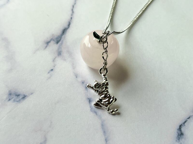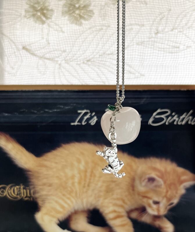 天然石のりんごに猫がよじのぼっているペンダントです。