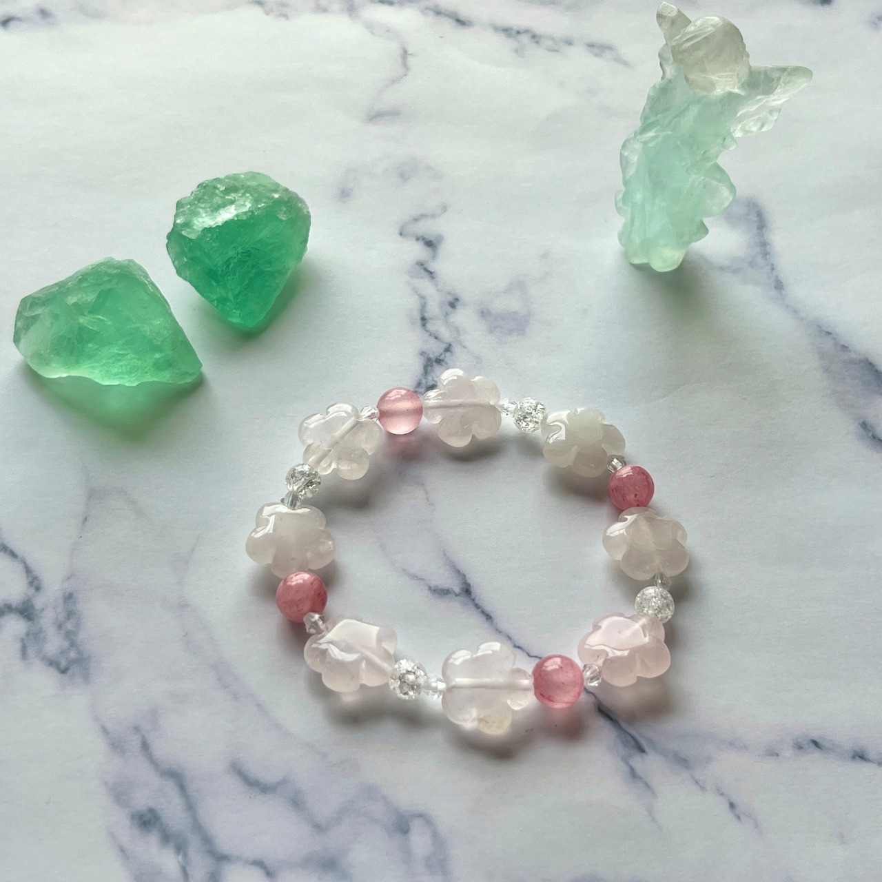 クォーツとローズクォーツのお花ブレスレットです。