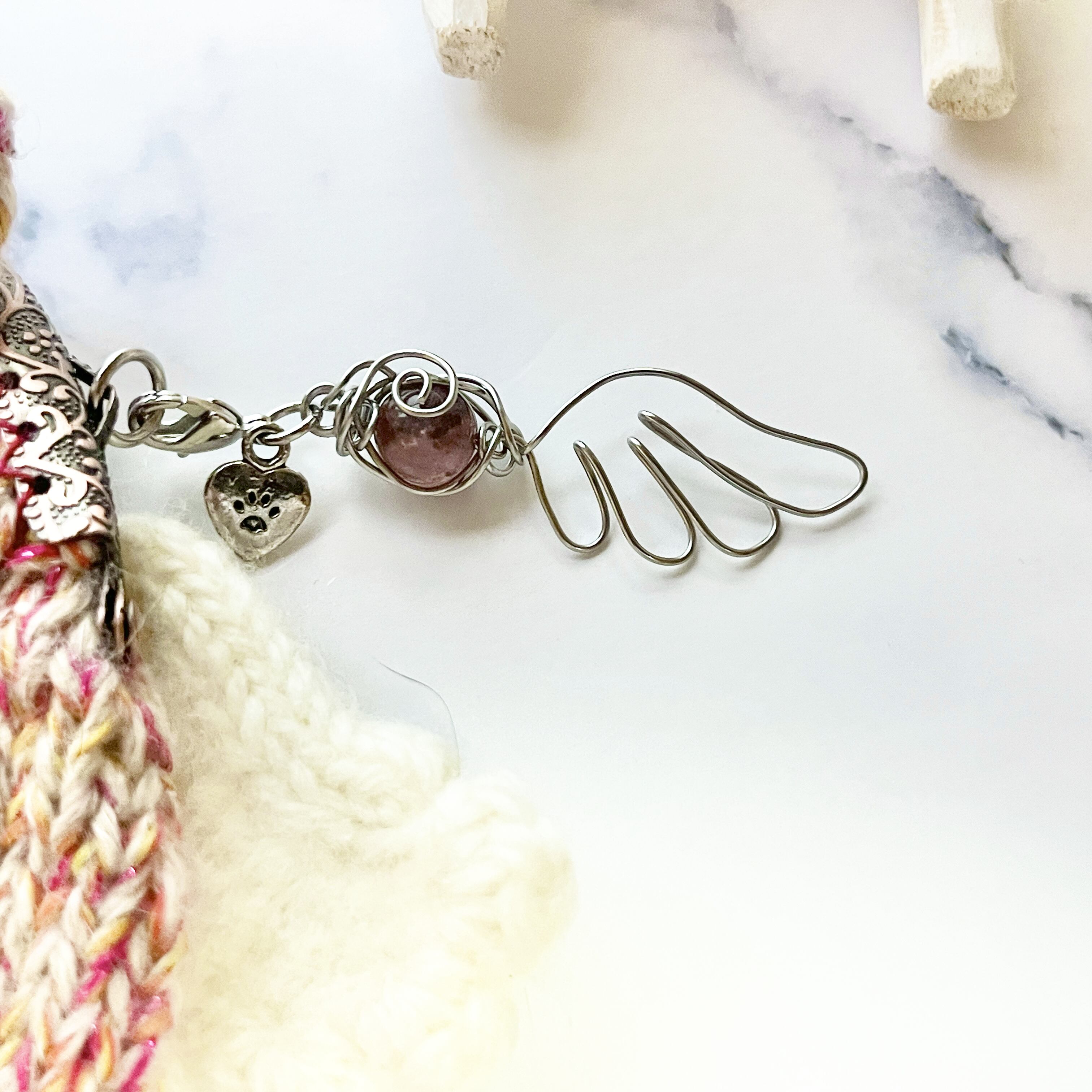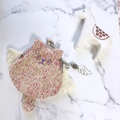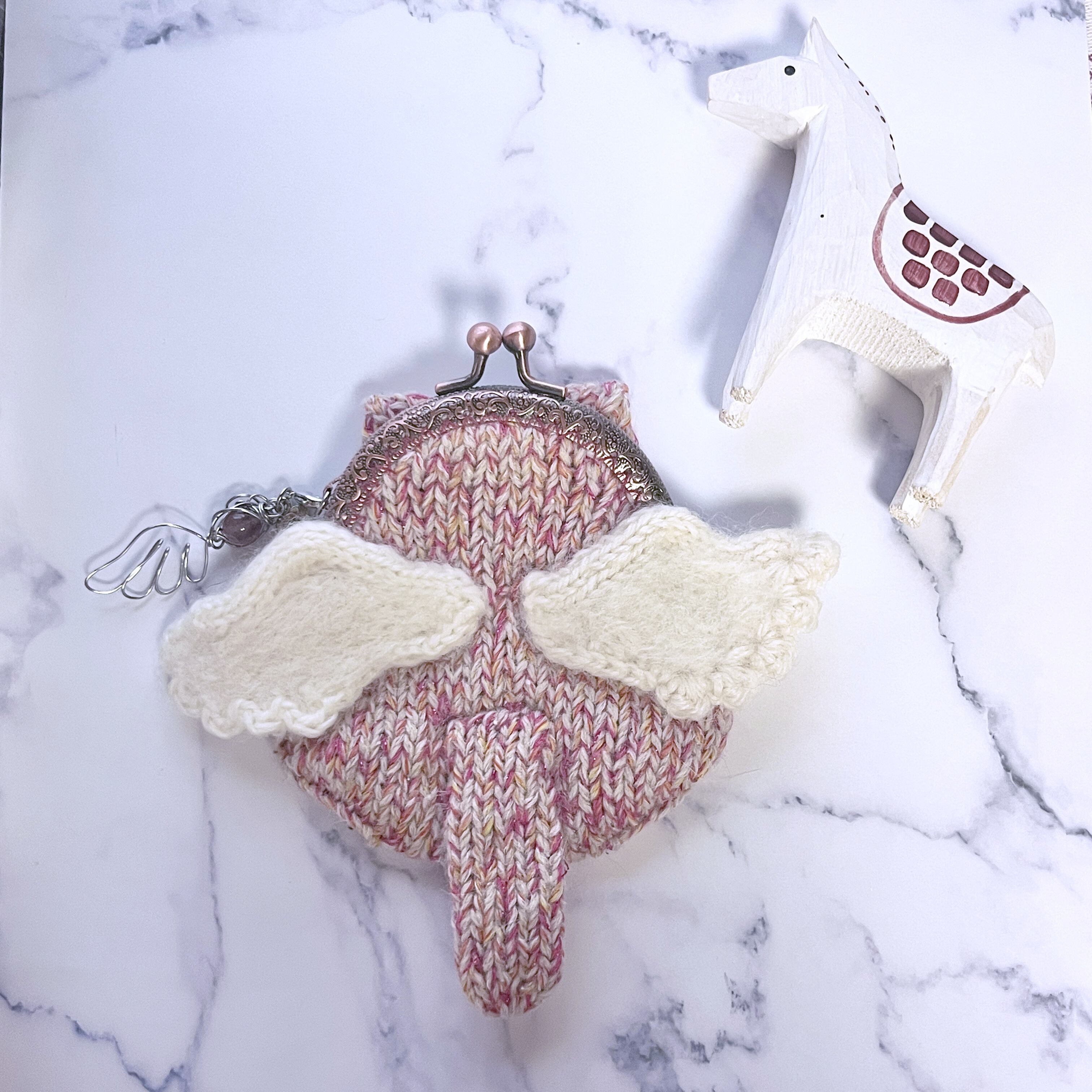 こちらは天然石(ストロベリークォーツ)をモチーフに毛糸を選び、引き揃えなどで編み上げ、背中には天使の羽根をつけました。
